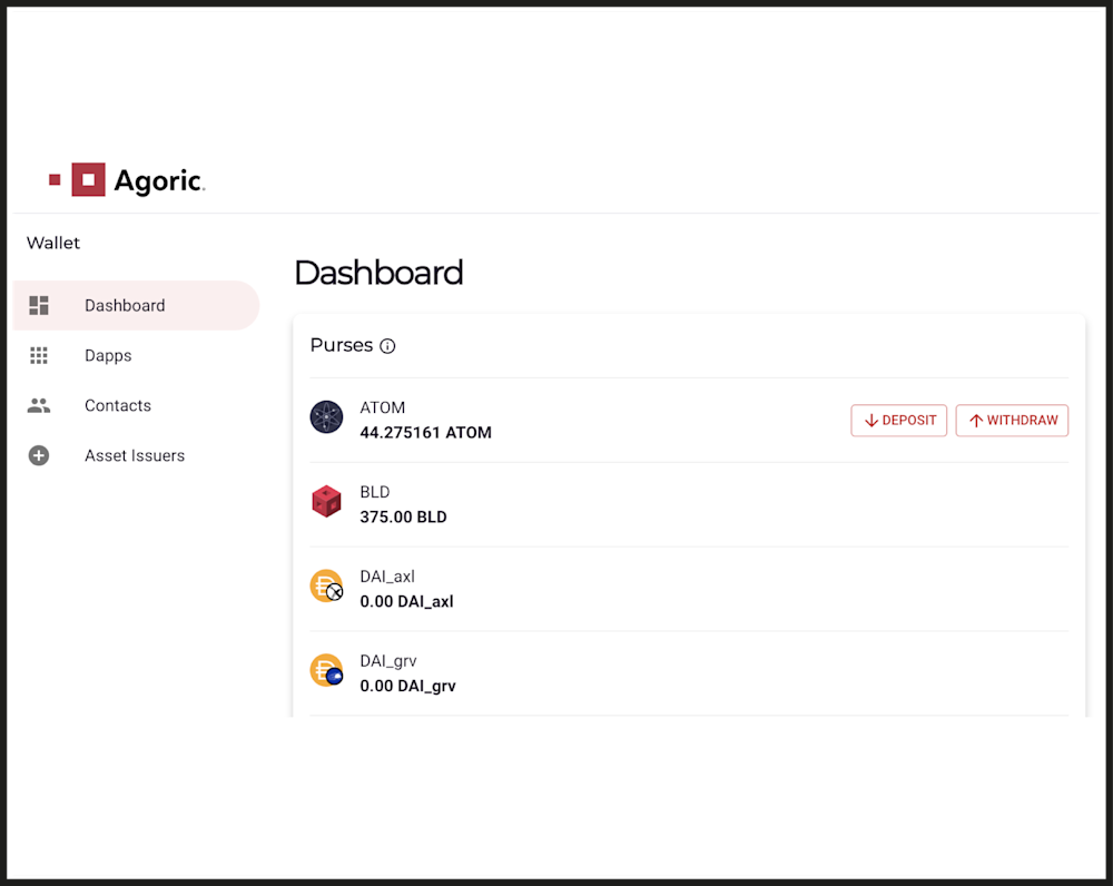 Start by launching the Agoric Smart Wallet App, and select the “Deposit” button to begin depositing your desired asset.