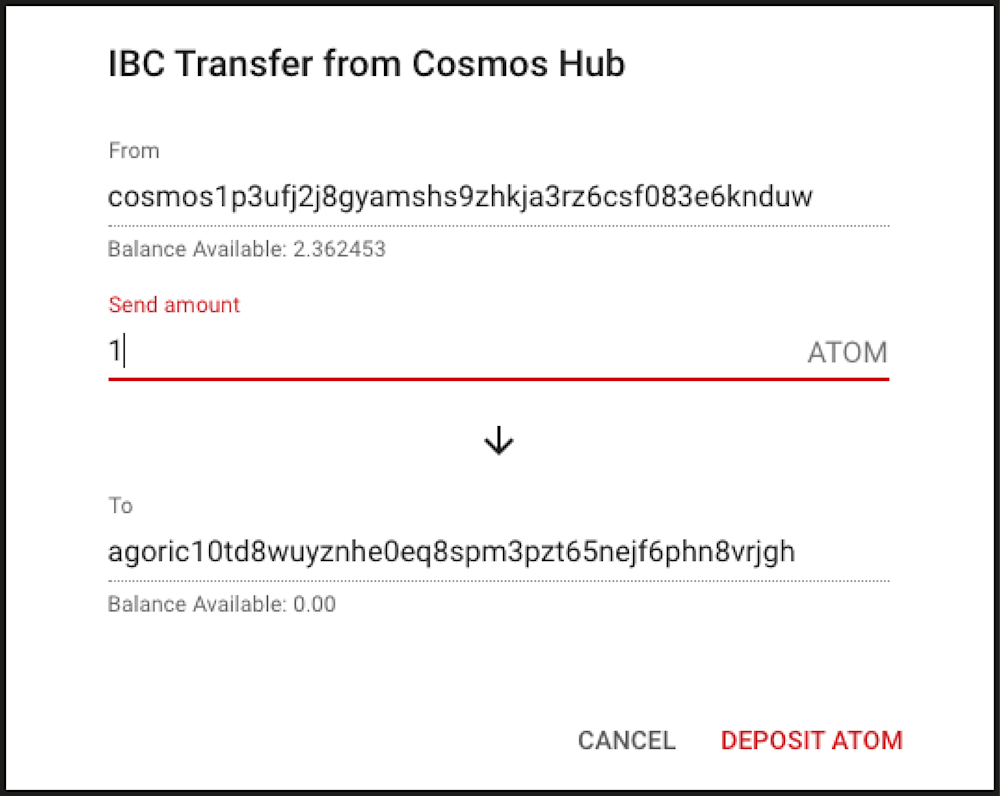 Note: The source chain address will default to the native token chain (i.e. Cosmos for ATOM).