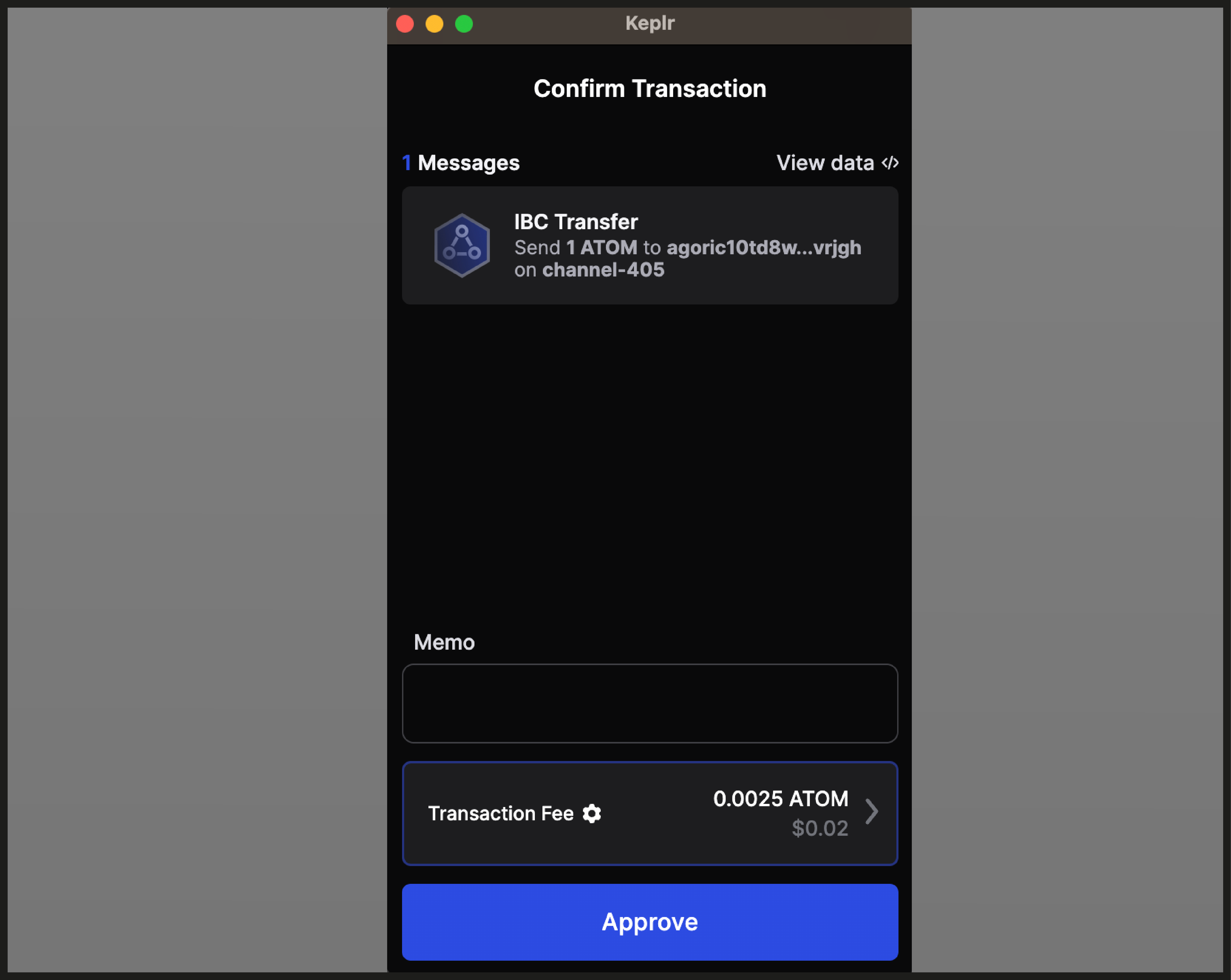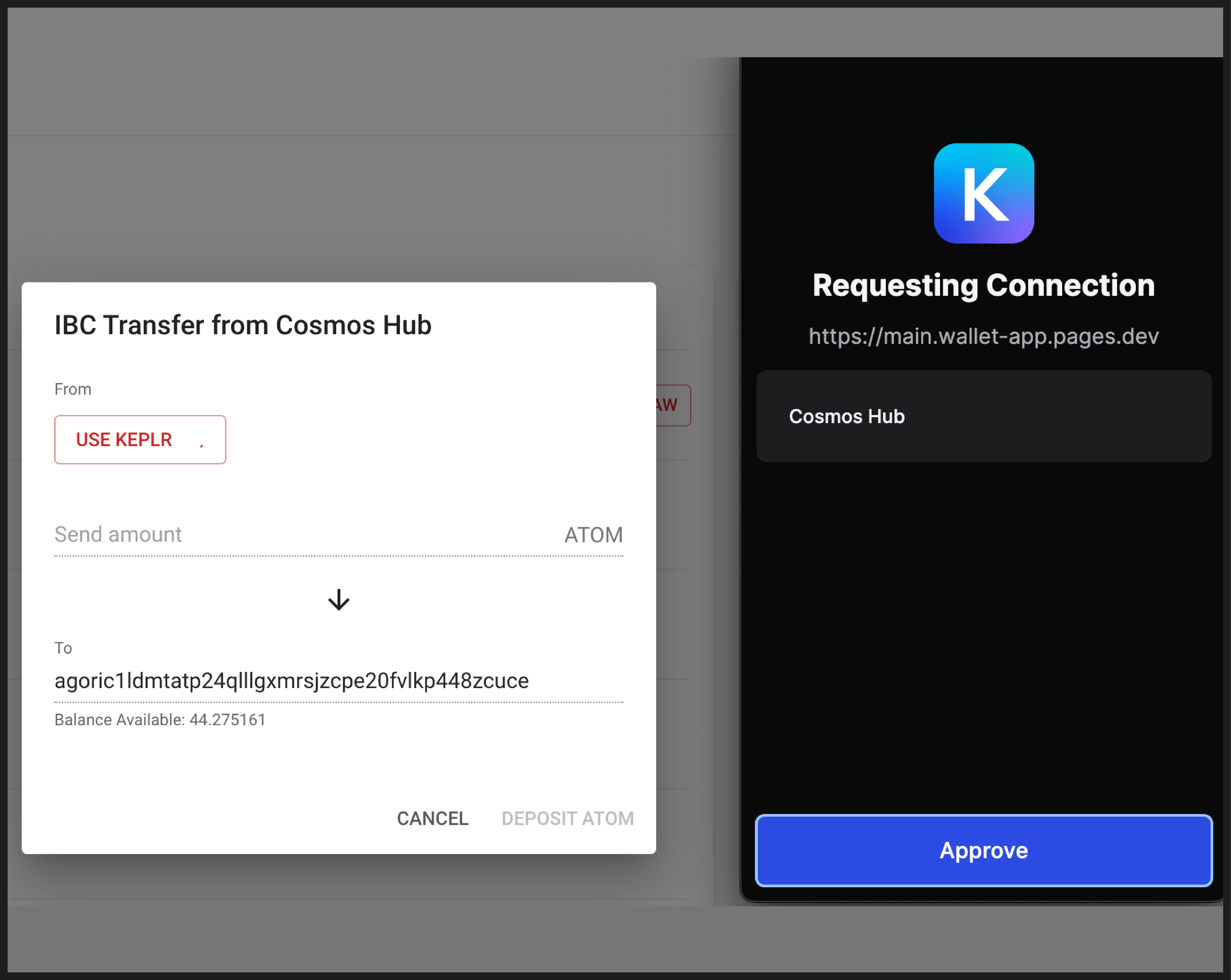 Selecting the “Deposit ATOM” button, will initiate the asset’s IBC transfer from the source chain to the Agoric chain. You’ll then be redirected to your Kepler wallet to approve the IBC transfer transaction.