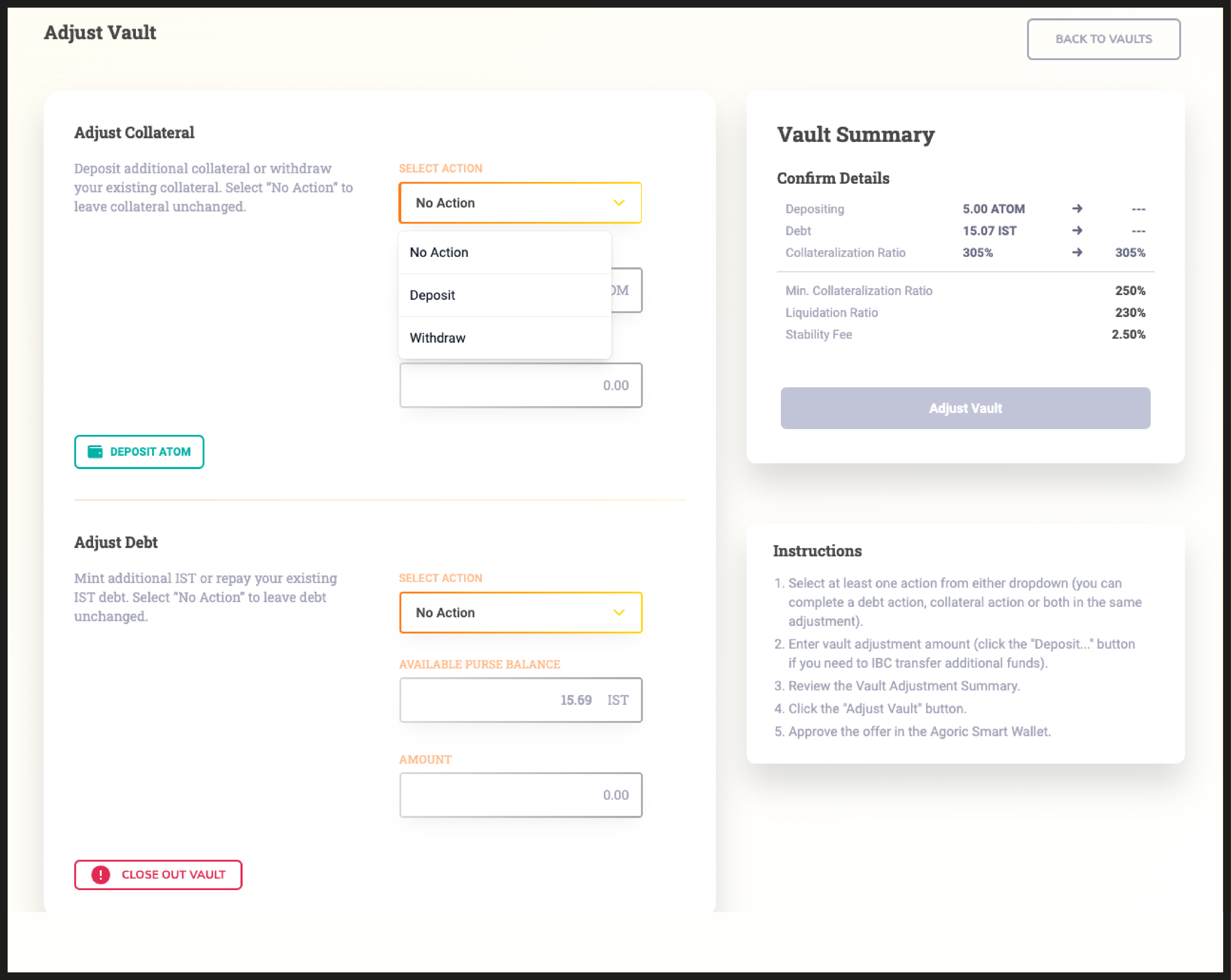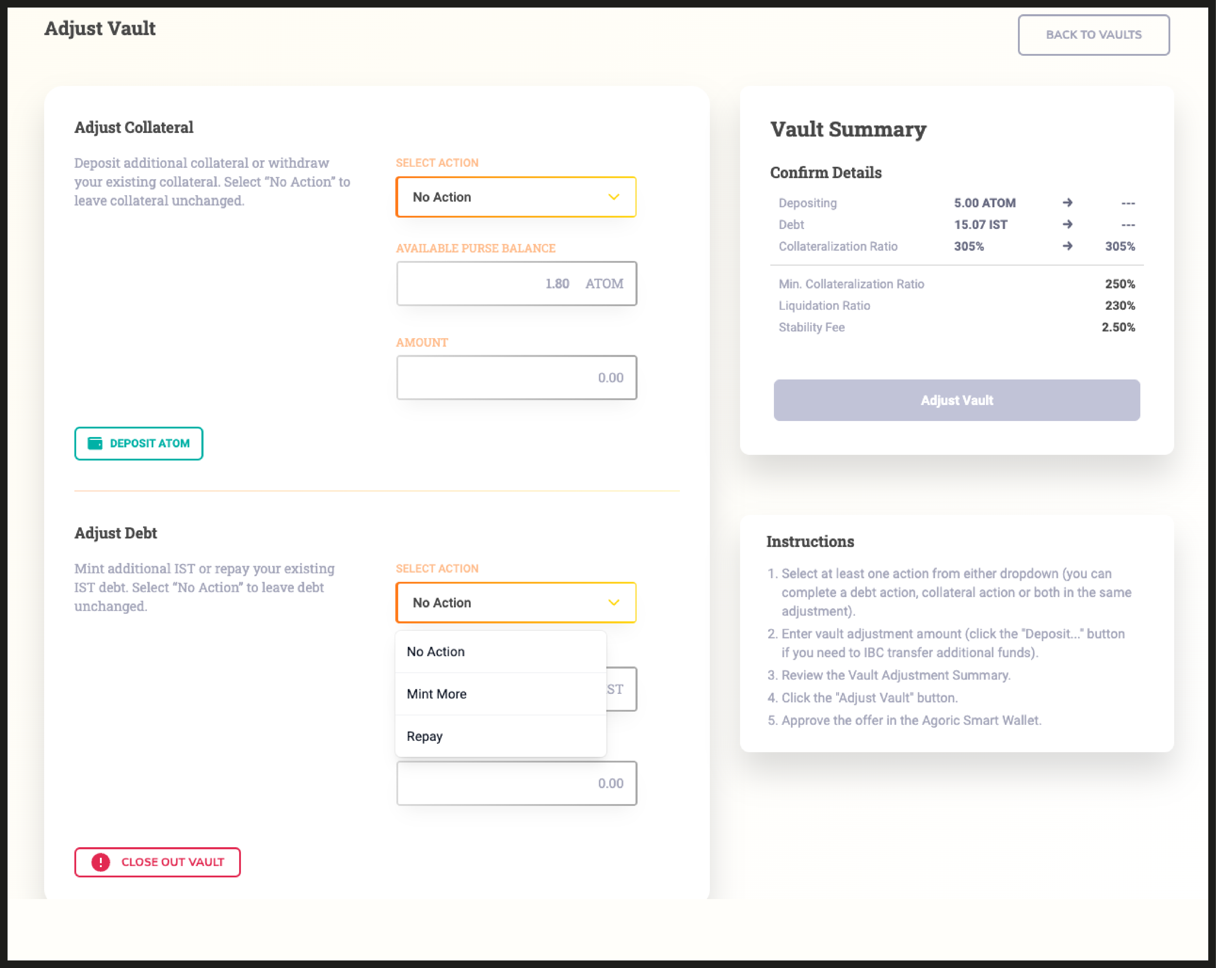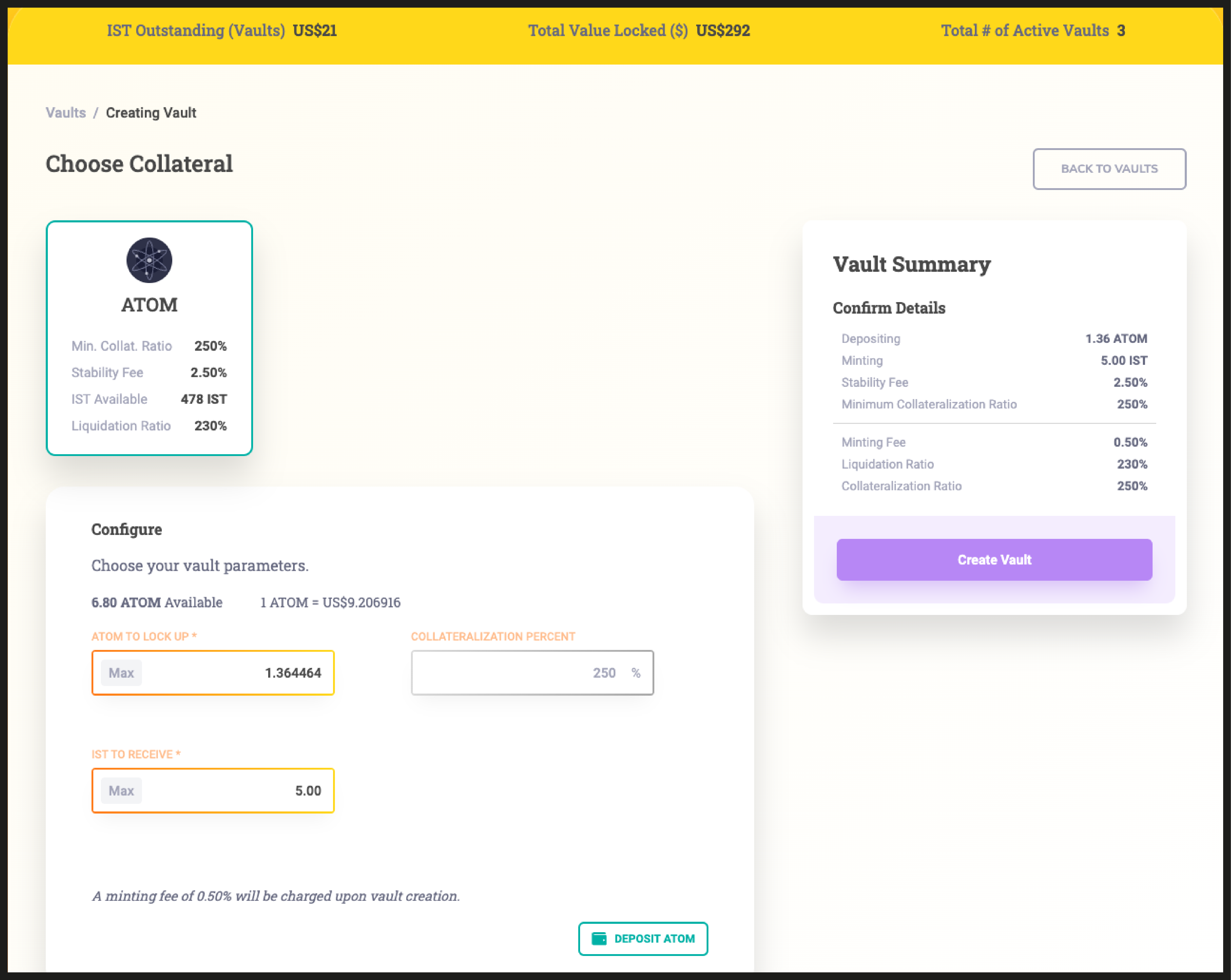 To create your first vault, specify the amount of ATOM you would like to deposit, and determine how much IST you wish to generate.
