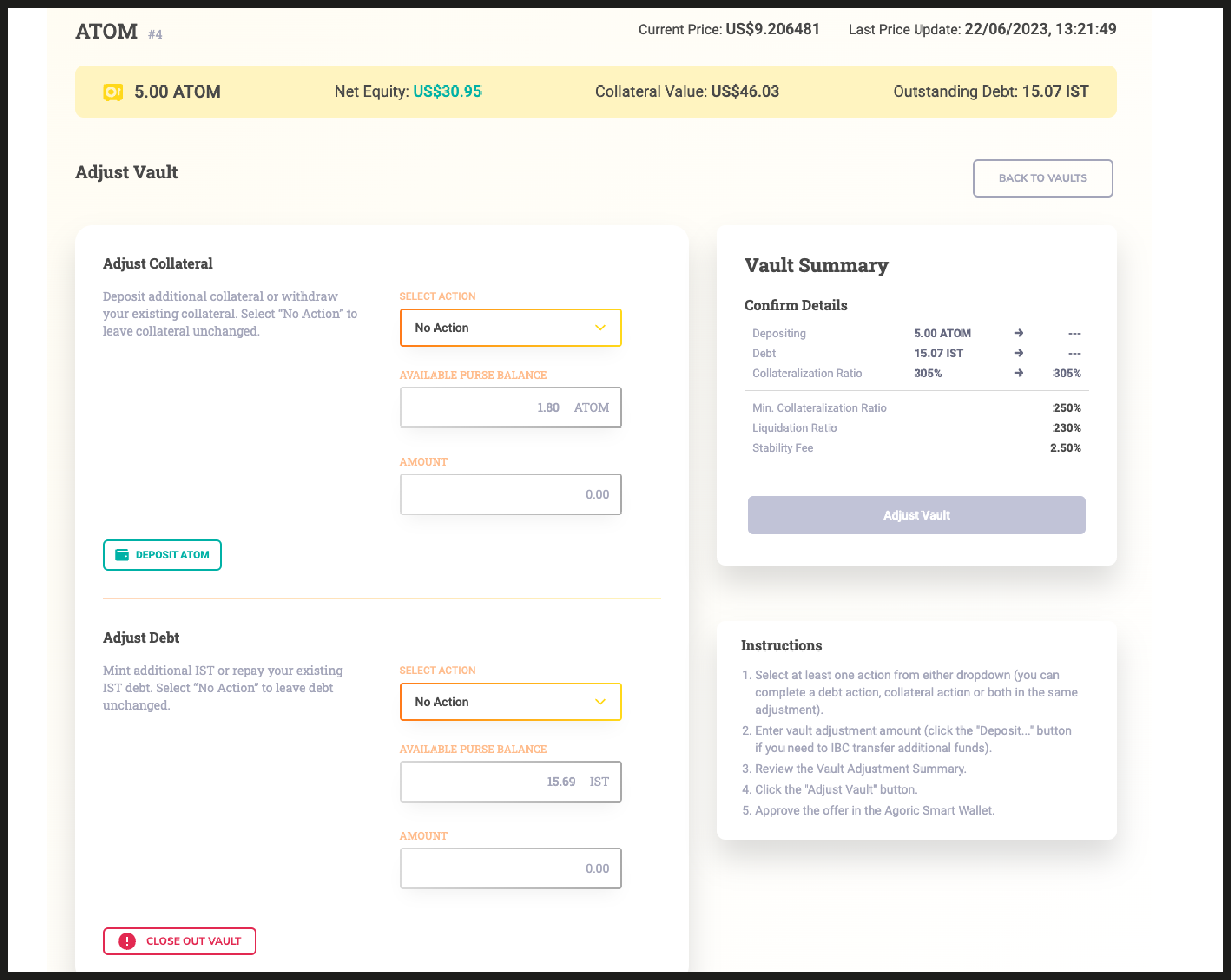 Once adjusted, select the “Adjust Vault” button to submit and approve the new offer in your Agoric Smart Wallet.