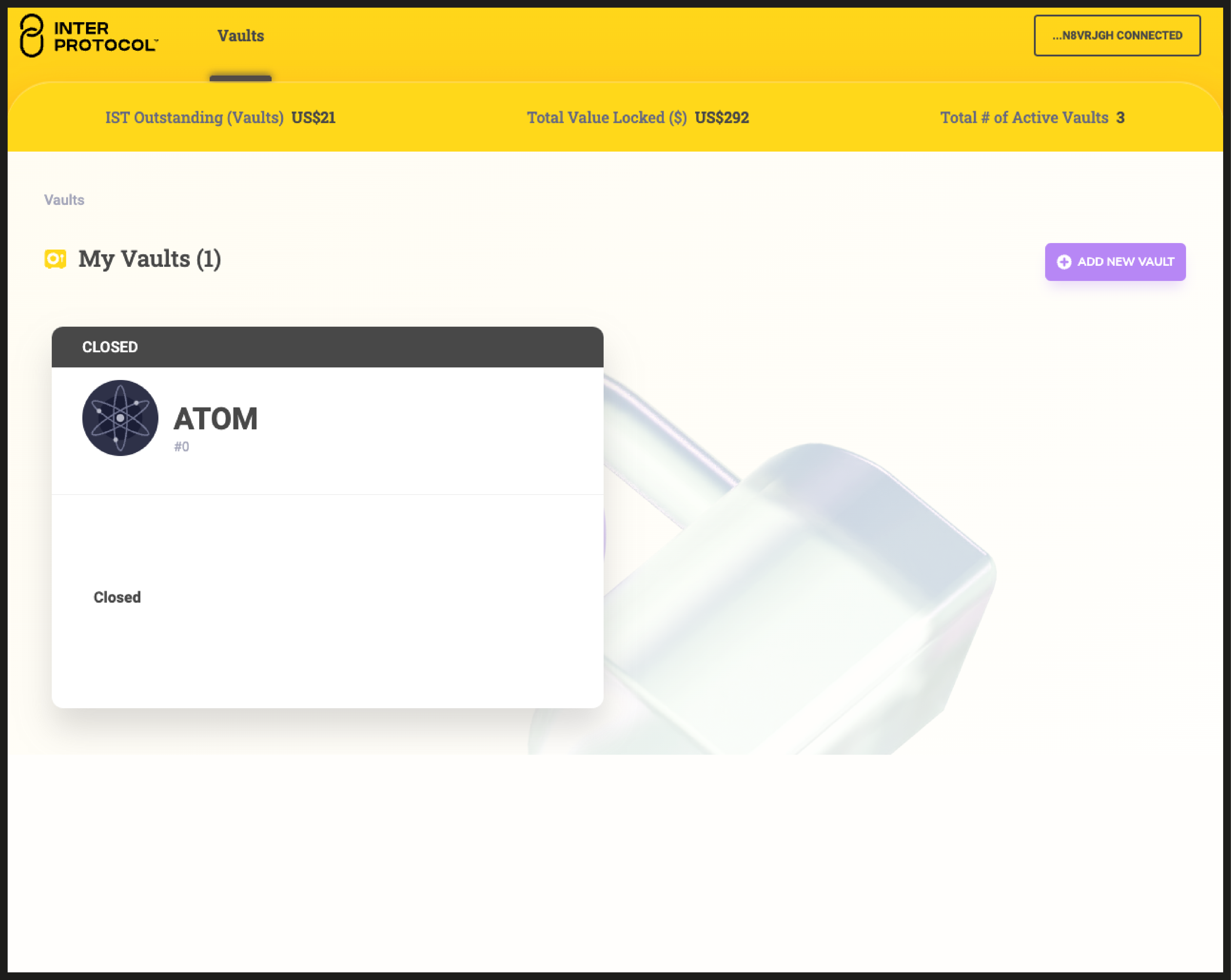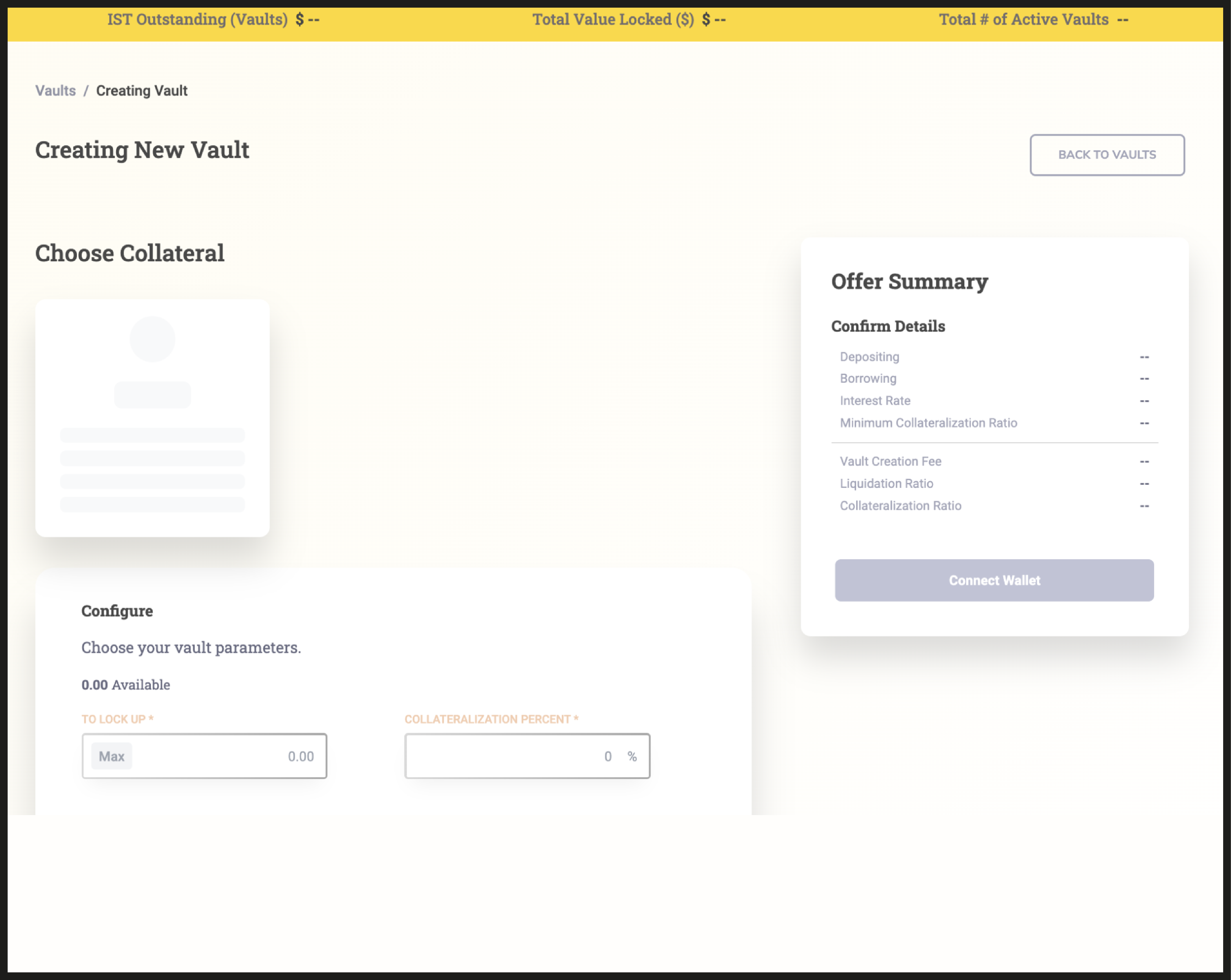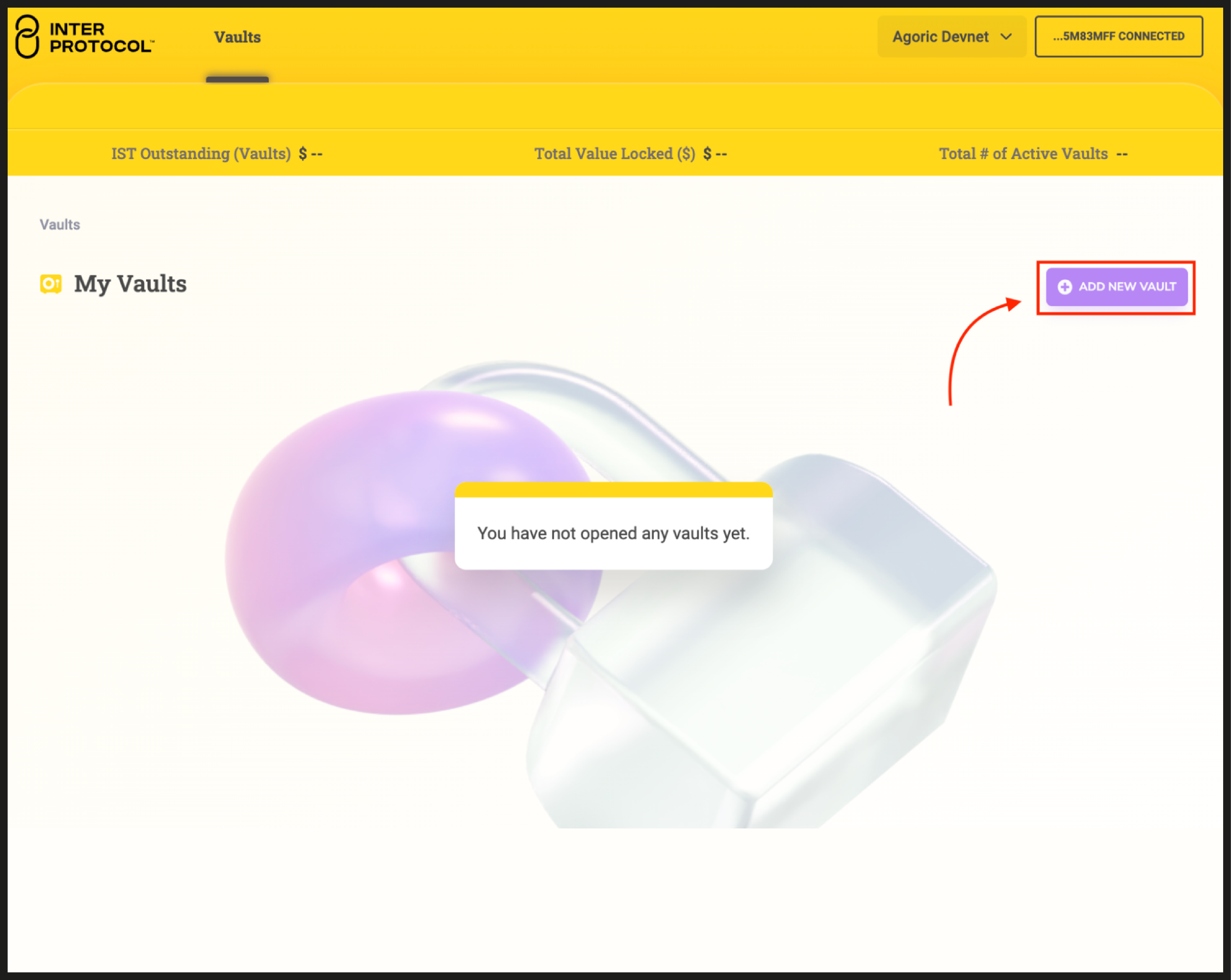 Once your wallet is connected, you will notice that there are no vaults created yet.