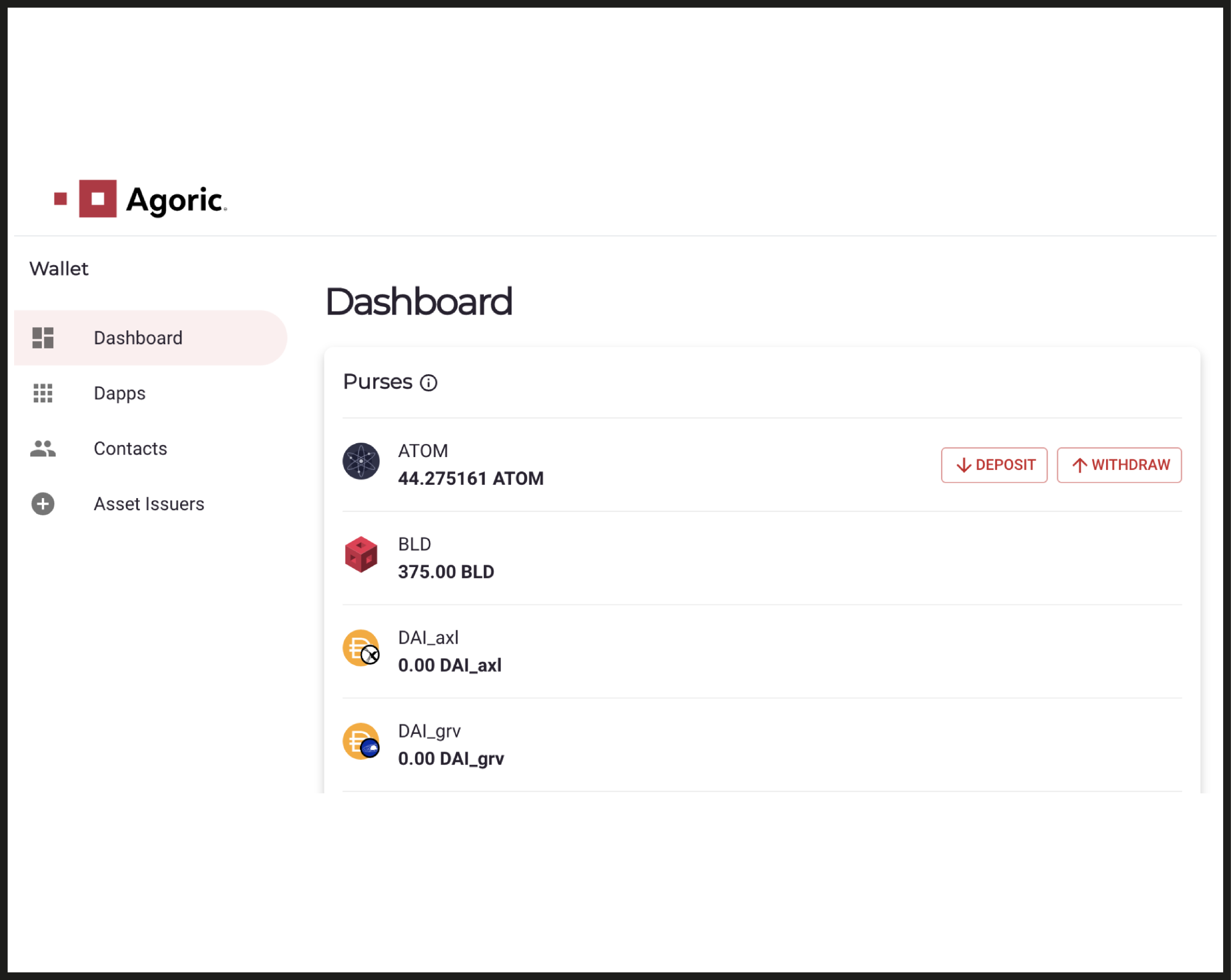 Start by launching the Agoric Smart Wallet App, and select the “Deposit” button to begin depositing your desired asset.