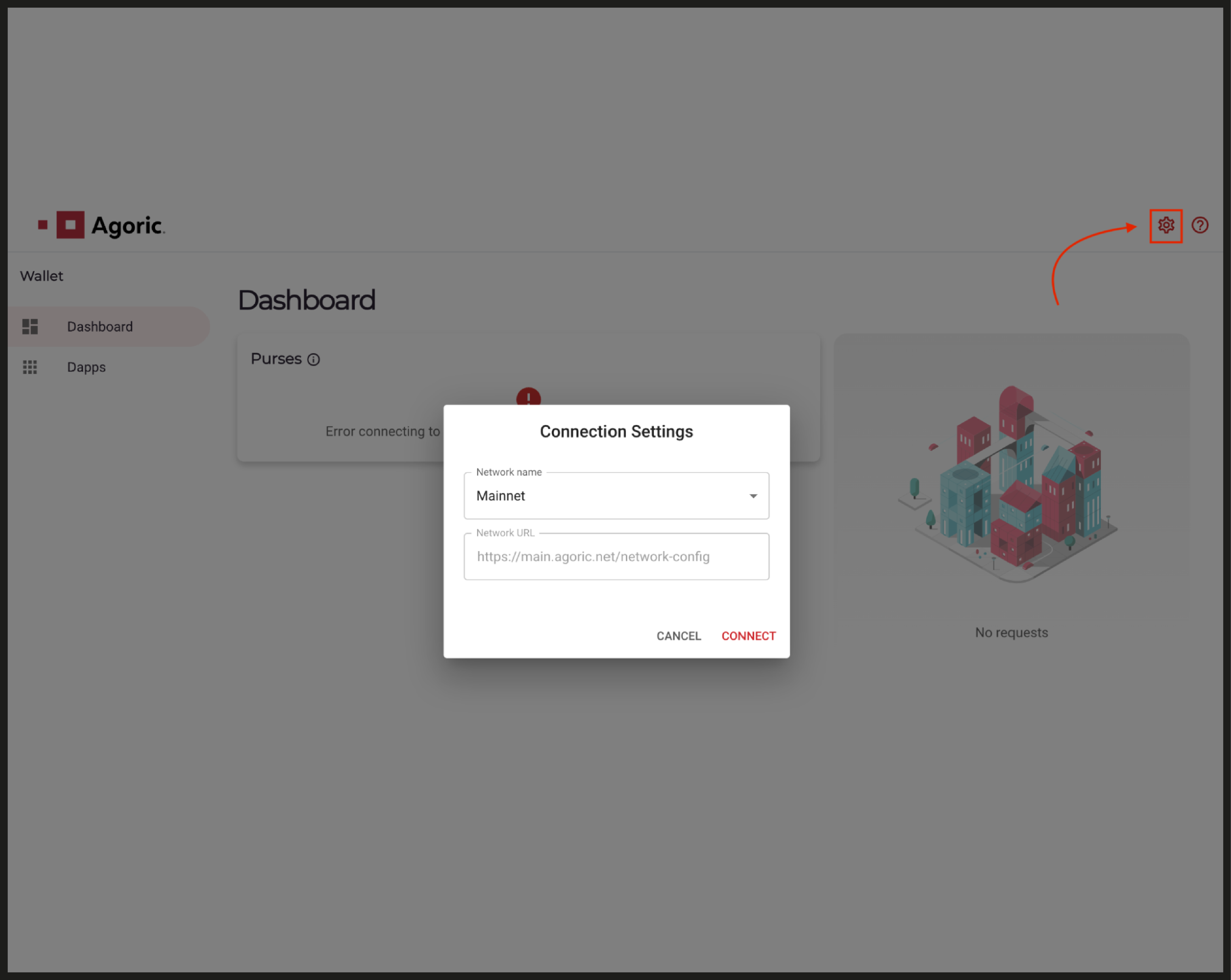 Start by accessing the wallet app and selecting the gear icon in the top right corner to open Connection Settings. The first time you connect, the terms of service will need to be accepted. Then, approve the Keplr connection to the Agoric chain.
