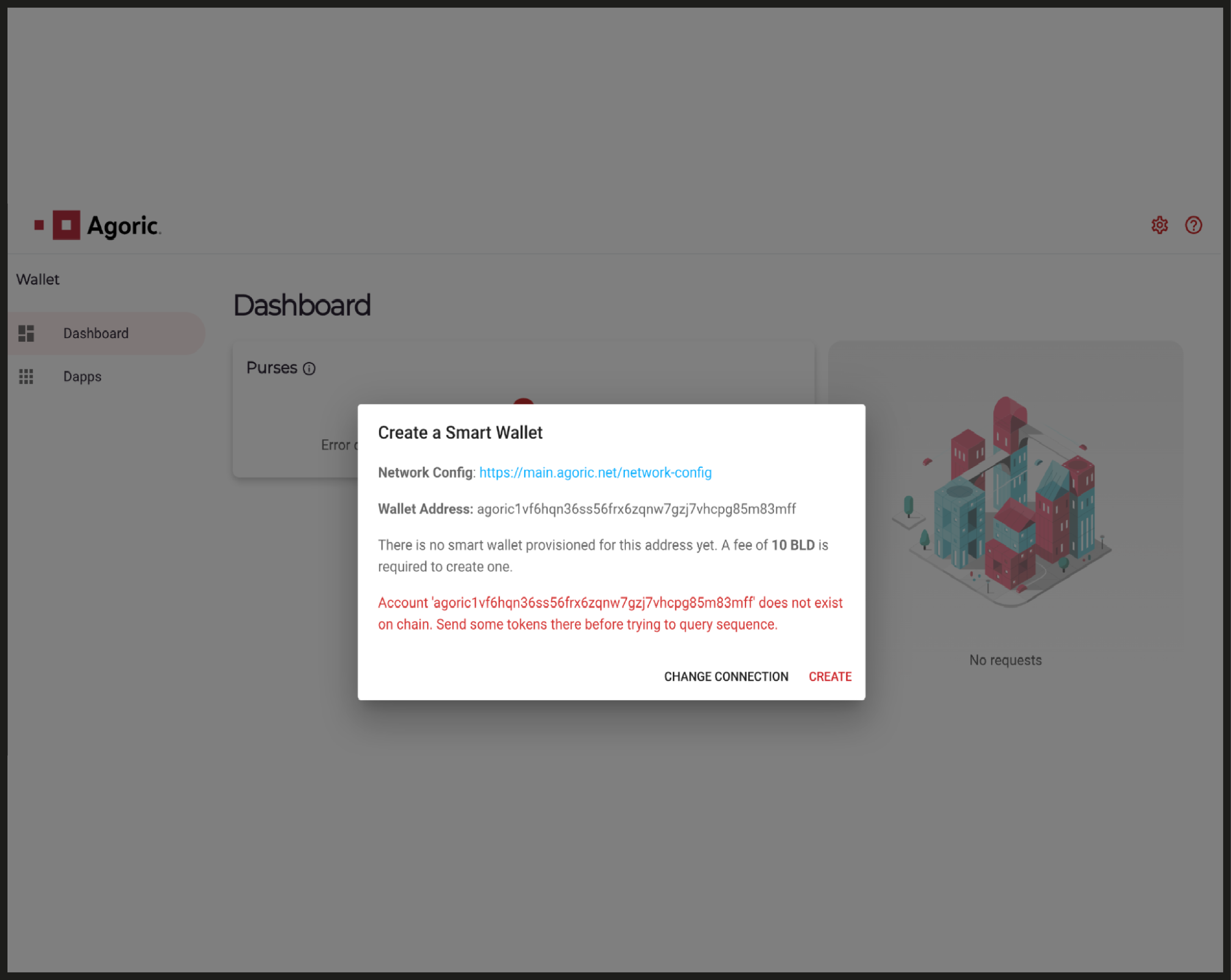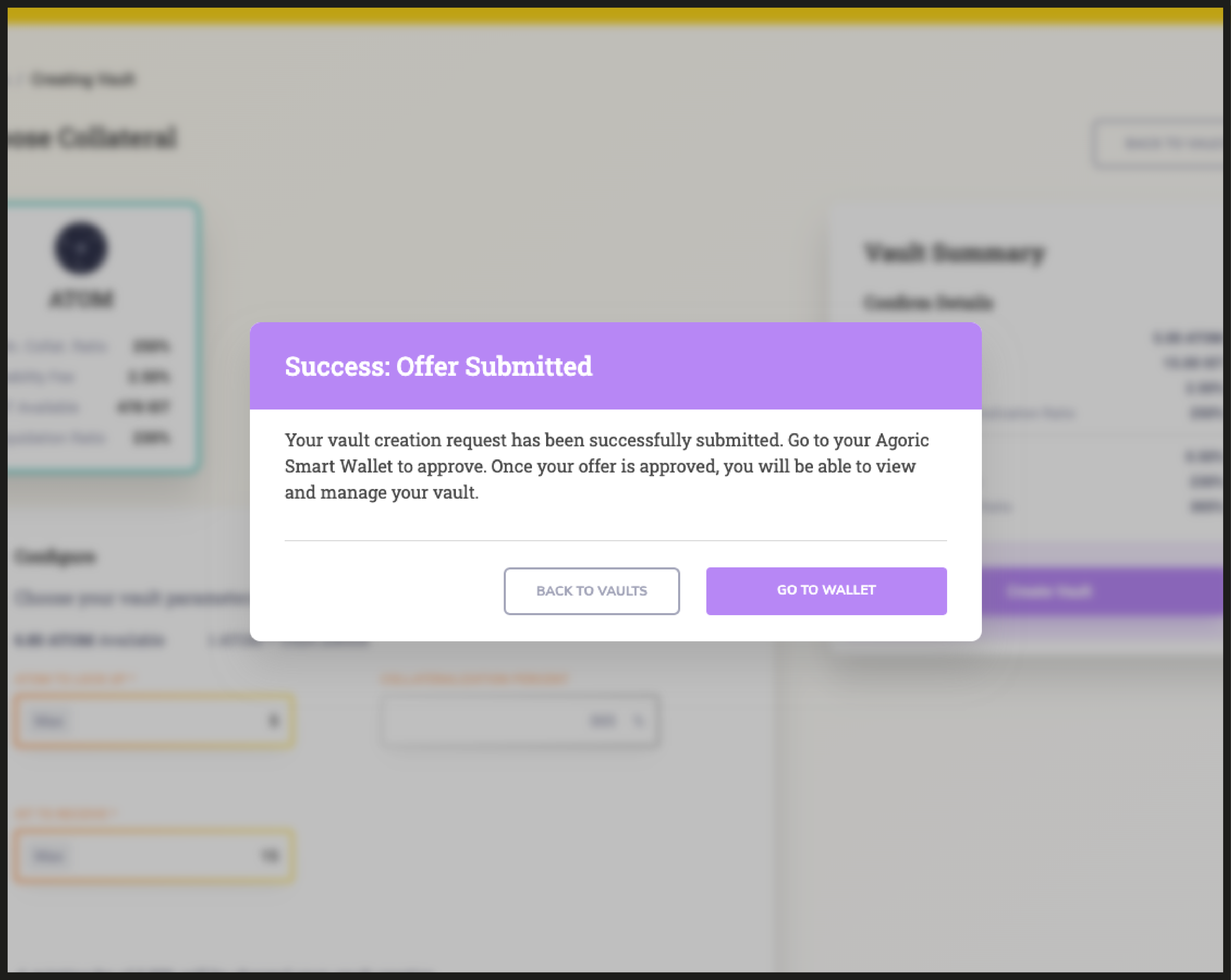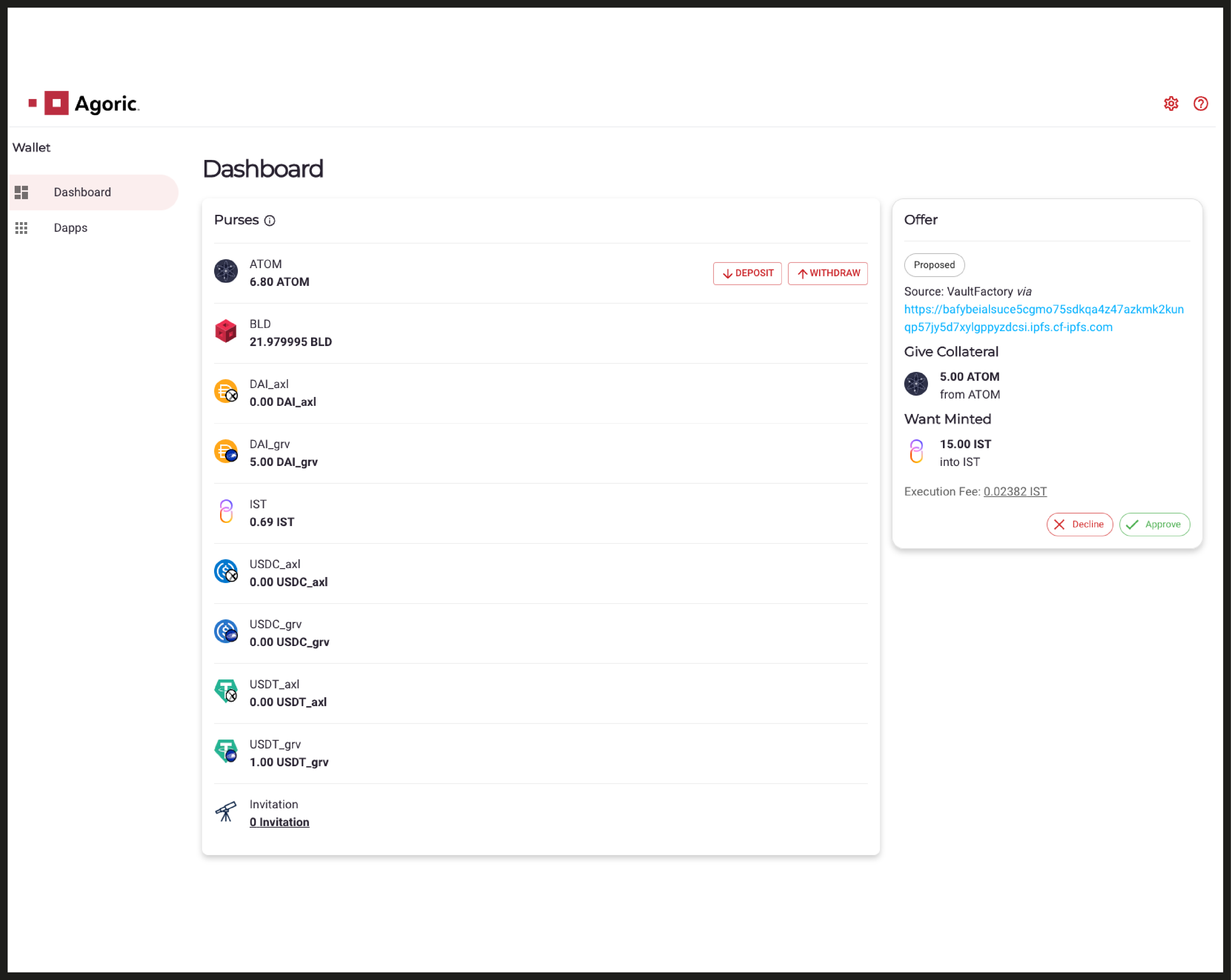 Once you have met the minimum collateralization ratio, navigate to the Agoric Smart Wallet dashboard to approve your vault creation request (known as a ‘Zoe Offer’ on the Agoric Platform).